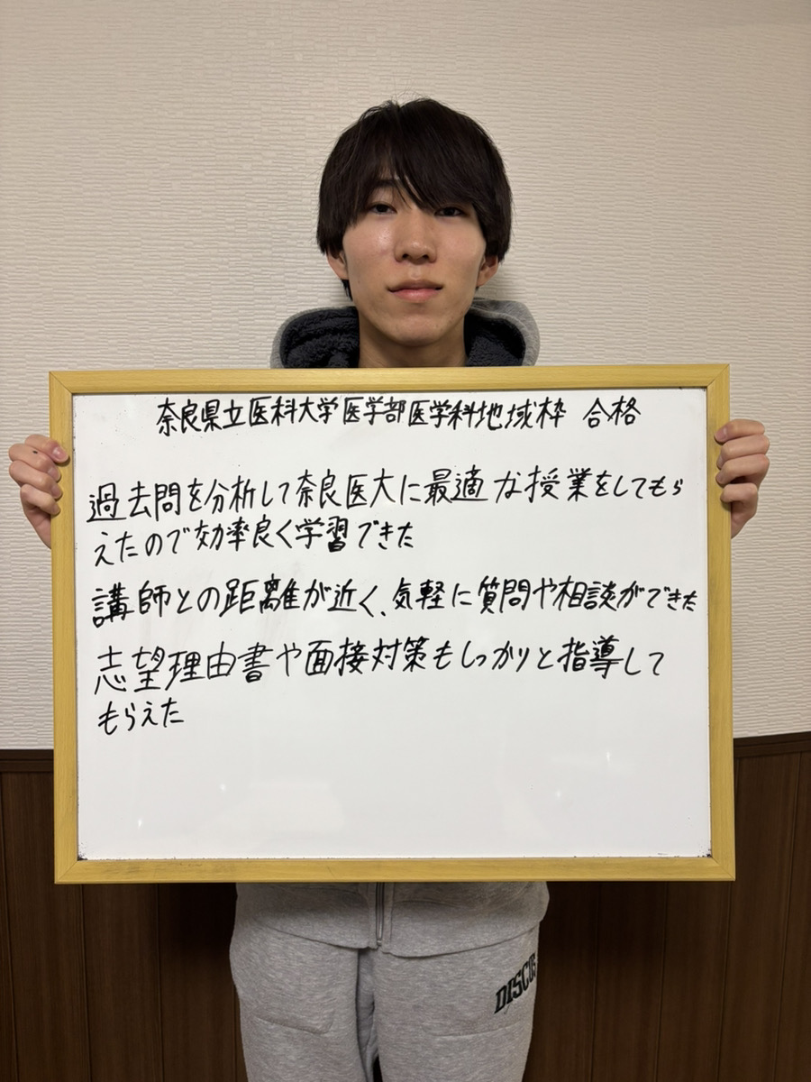過去問を分析して、奈良医大に最適な授業をしてもらえたので、効率よく学習できた。 講師との距離が近く、気軽に質問や相談ができた。 志望理由書や面接対策もしっかりと指導してもらえた。 ...
