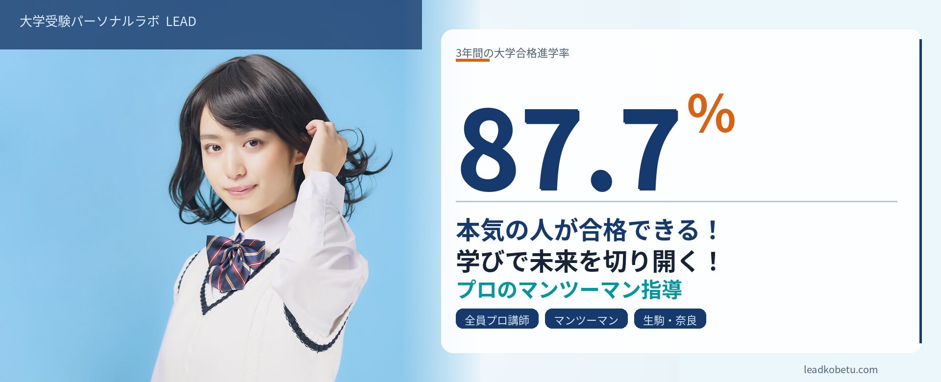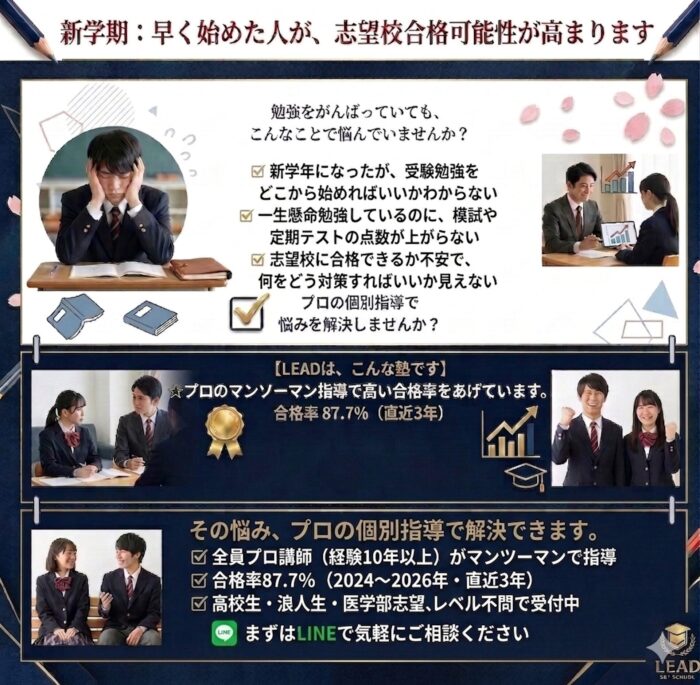 LEADは、受験対策だけでなく、学期テスト対策など自分のしたい対策に合わせて授業していただけ、先生と話しやすい環境に加え、特別補講という無料で19:50〜夜遅い時間まで質問対応してくださったことで、勉強する力が以前に比べて格段に身について...