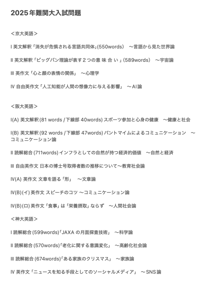 たとえば、2025年度の京大や阪大、東大などの難関国公立大学では、英語や国語の試験で「AIと想像力」「死の定義」「都市化」「博士号の意義」「タンザニア社会」など、人間や社会に関わる本質的なテーマが出題されました。